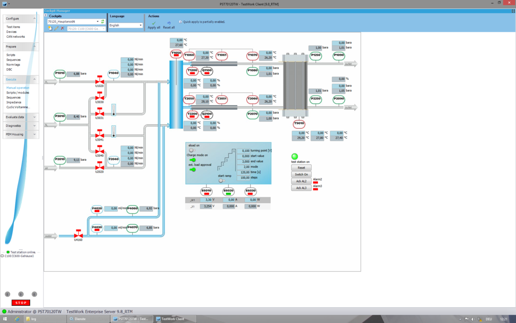 A further component of navigation is the emphasis “Diagnosis” that, amongst others, includes the visualization of the current test station alarm status. Alarms correspond to firmly defined system limits that either indicate a disturbance or initiate defined actions in case of exceeding or falling below the concerned limit. Depending on the alarm status, the navigation bar is either colored blue-gray (no alarm), yellow (Alarm 2) or red (Alarm 3).